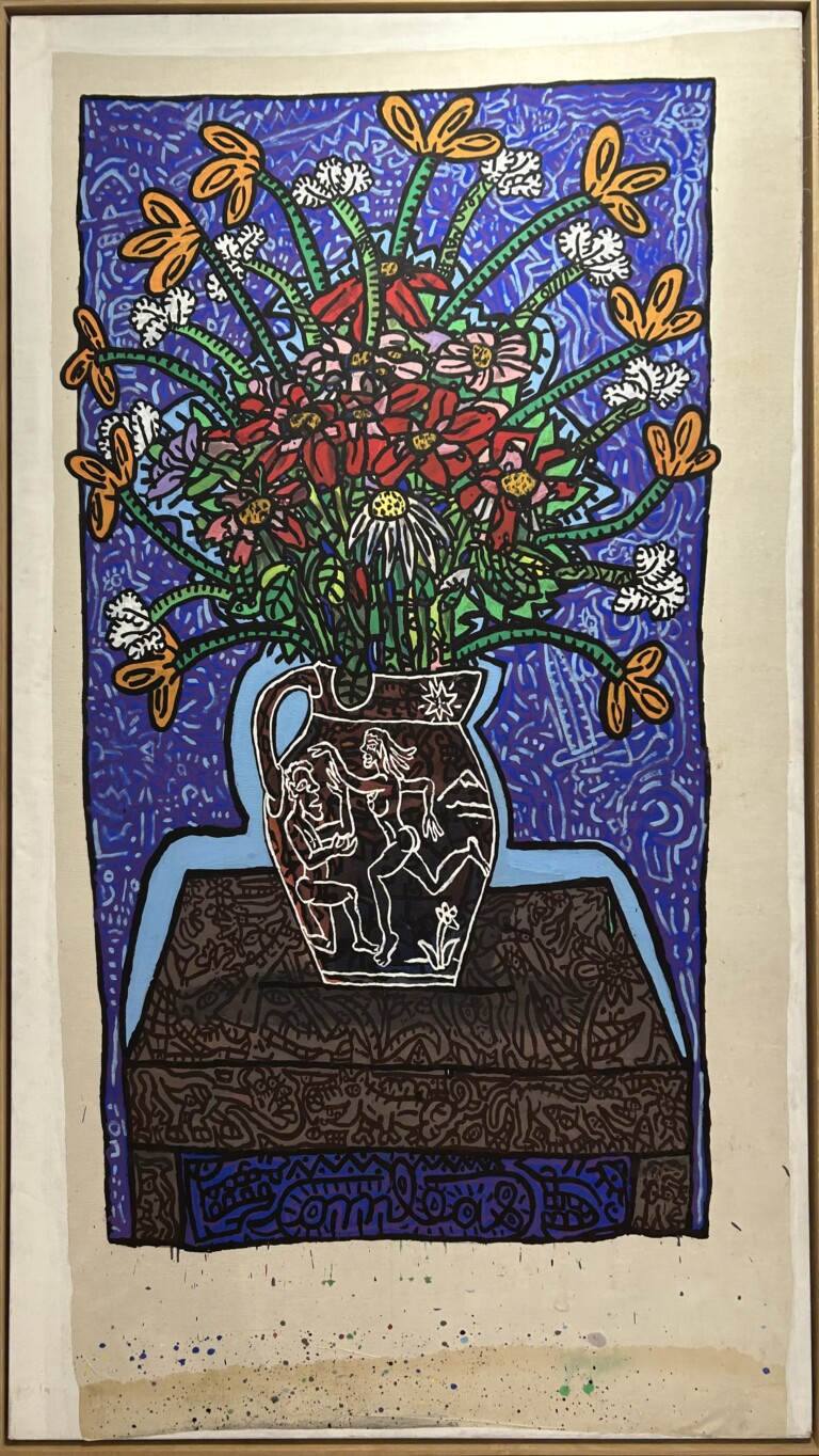 Sur la table basse ,un vase érotique regorgeant de fleurs exotiques
