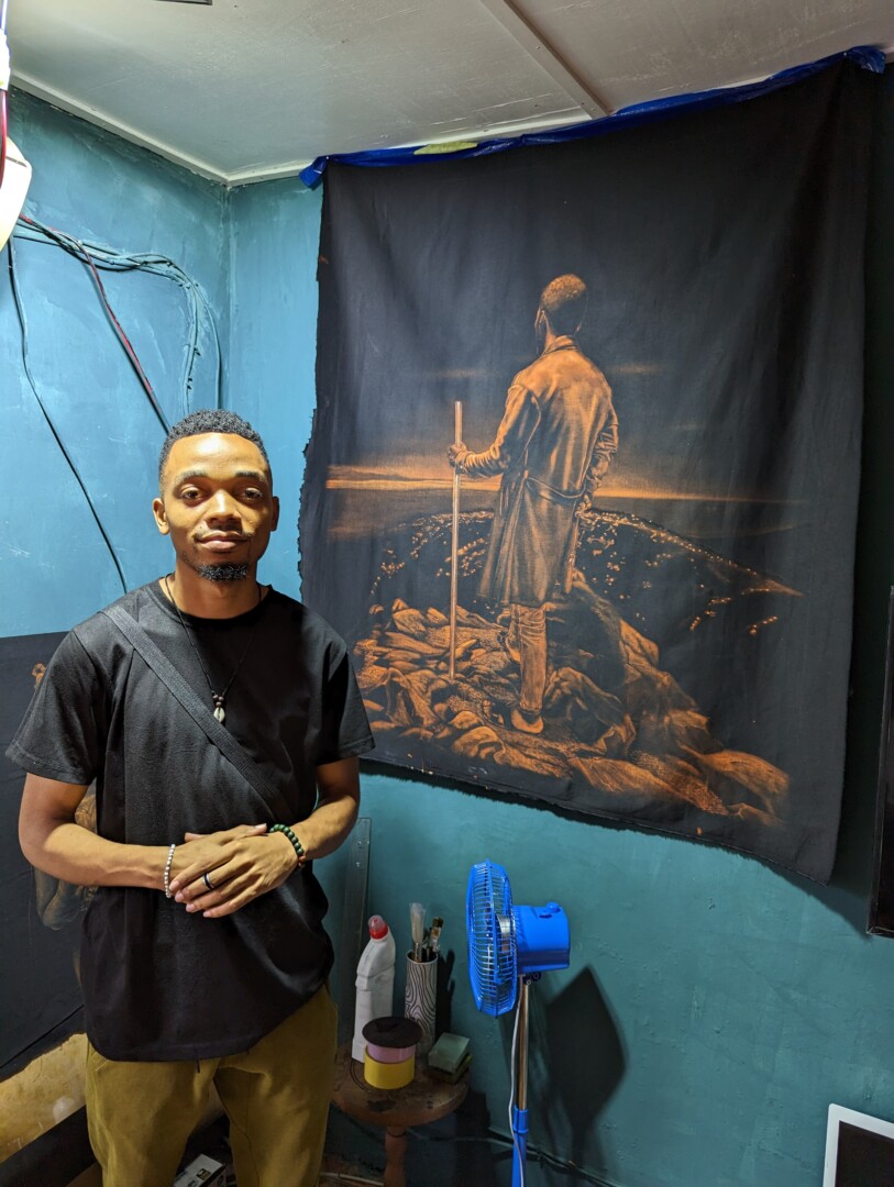 Born in 2003 in Buvaku, eastern Congo, the youngest of eight siblings, Eli lost his parents when he was a teenager. This was followed by years of depression, which he managed to heal himself by watching online conferences on mental resilience. In 2021, he moved to Kinshasa to enter the Academy of Fine Arts, but decided to leave after his first year to pursue a self-taught career. He produced commissioned portraits and T-shirt designs using the tie and dye technique, using bleach. He came up with the idea of using this bleaching technique on canvas. At the end of 2022, he launched into a series of portraits based on his personal experience of psychological pain and the quest for inner peace. His development was rapid. Despite his very young age, thanks to the originality of his technique and his mastery, he already has an extremely strong artistic signature.